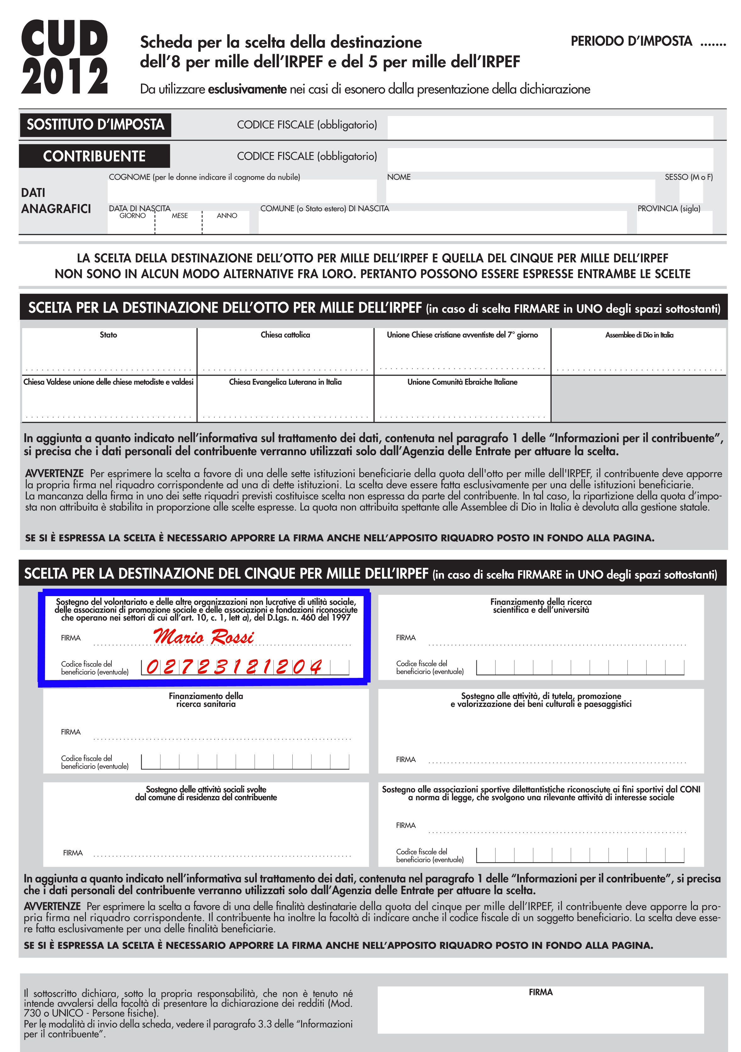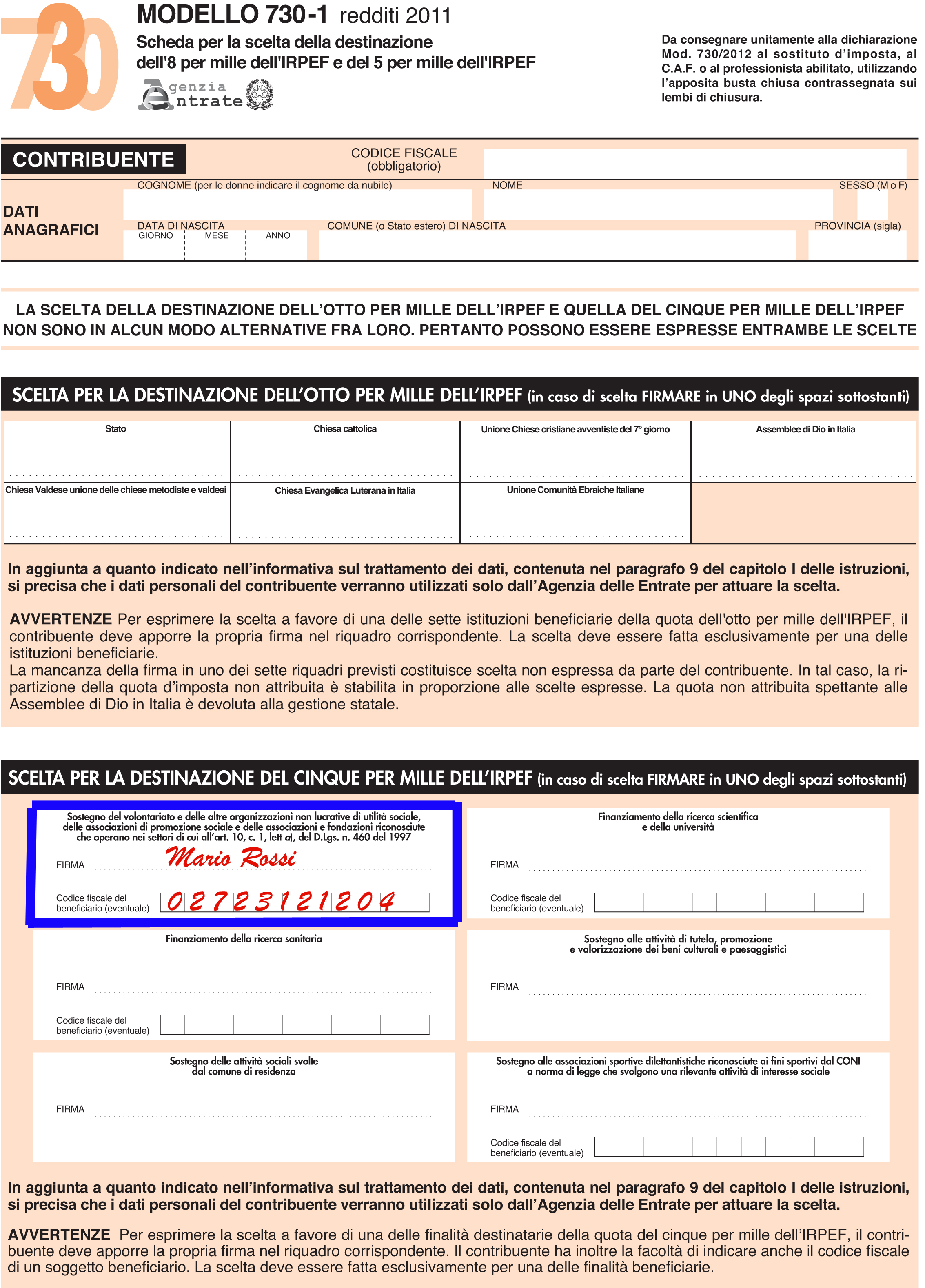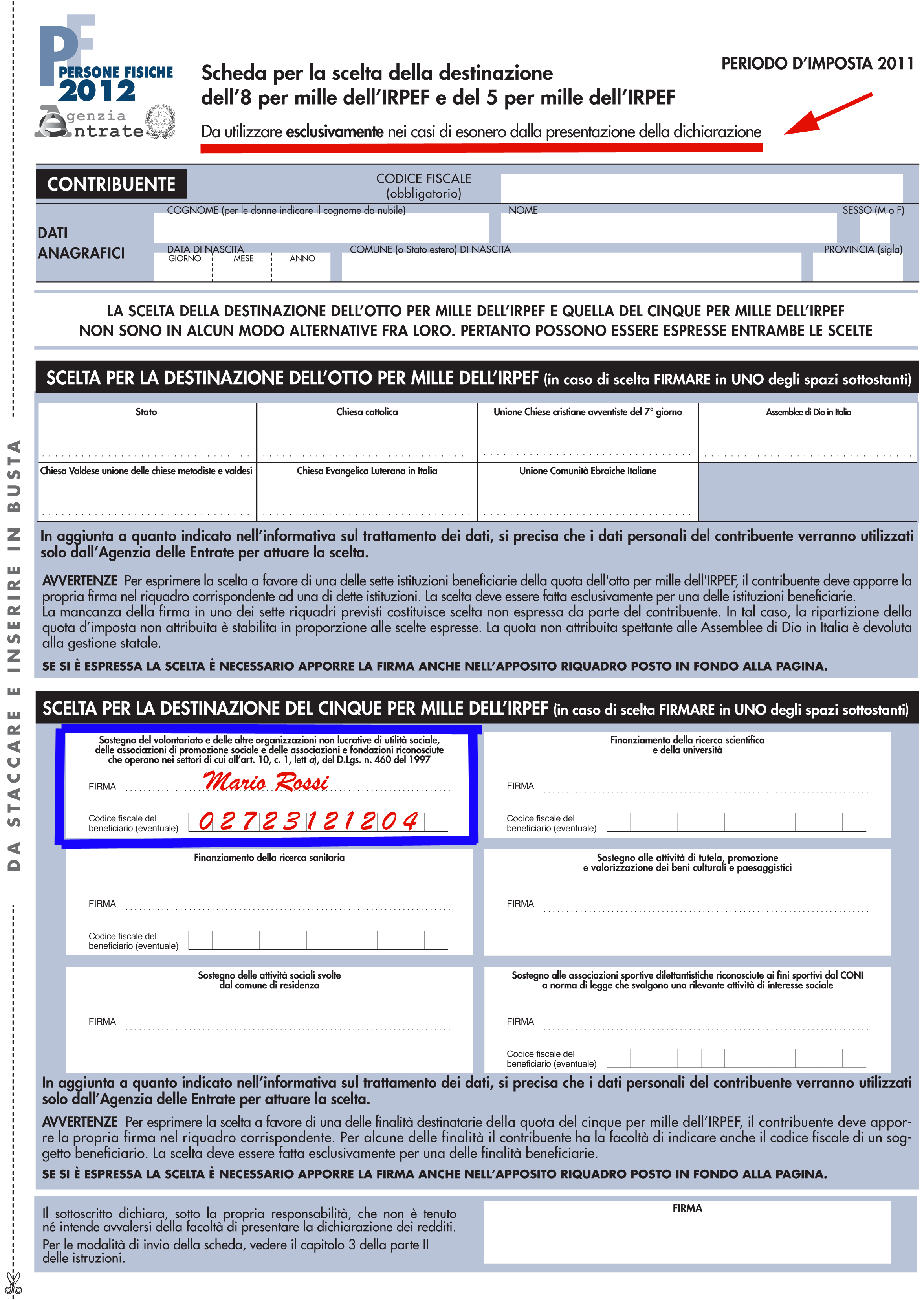 Basta firmare, a seconda dei casi, nell’apposito riquadro del CUD 2012, del modello 730/2012, del Modello Unico Persone Fisiche 2012 oppure del modello Unico Persone fisiche “Mini” (che è una versione semplificata, ideata per agevolare i contribuenti che si trovano nelle situazioni meno complesse), e riportare nell’apposito spazio il codice fiscale dell’organizzazione che è 02723121204.